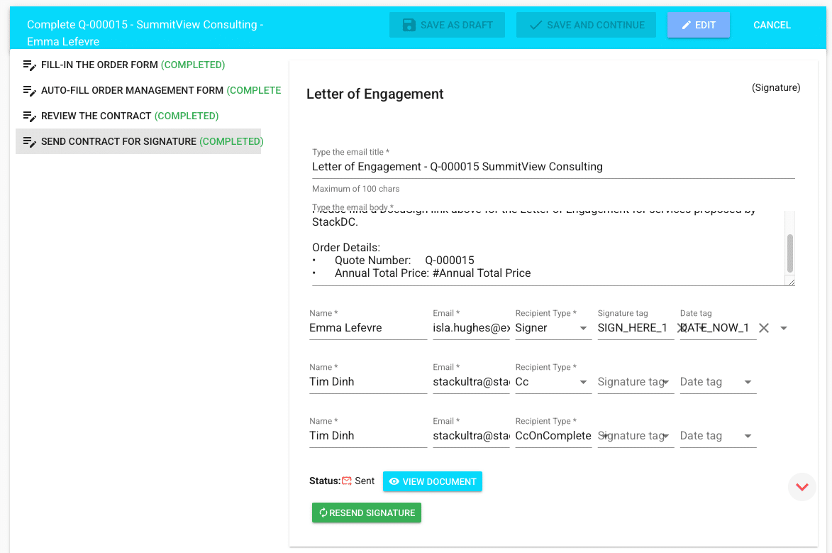 Enable DocuSign e-signature envelopes automatically, allowing you to easily track if contract has been delivered, viewed, or signed. Upon completion, attachments are automatically stored in the cloud for audit and control.